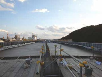 大気圧を利用し余剰水を吸引除去することで、コンクリートの表層強度が早く実現するので、工期が短縮でき、工事費のコストダウンになります。